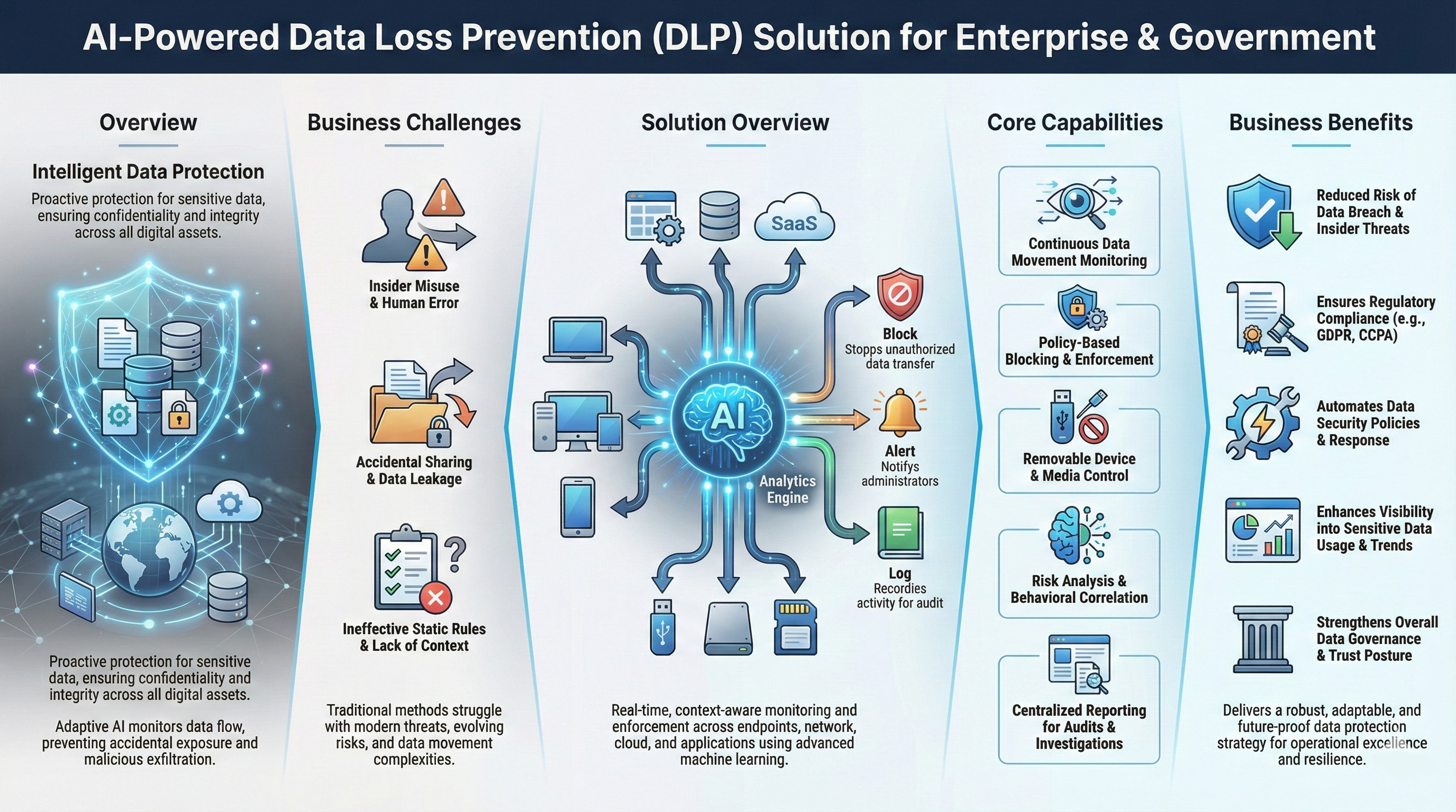 The AI Powered Data Loss Prevention Solution provides intelligent and adaptive protection against data leakage by monitoring how data is accessed, used, and shared across endpoints and networks. It enables organizations to proactively prevent data loss rather than reacting after incidents occur.