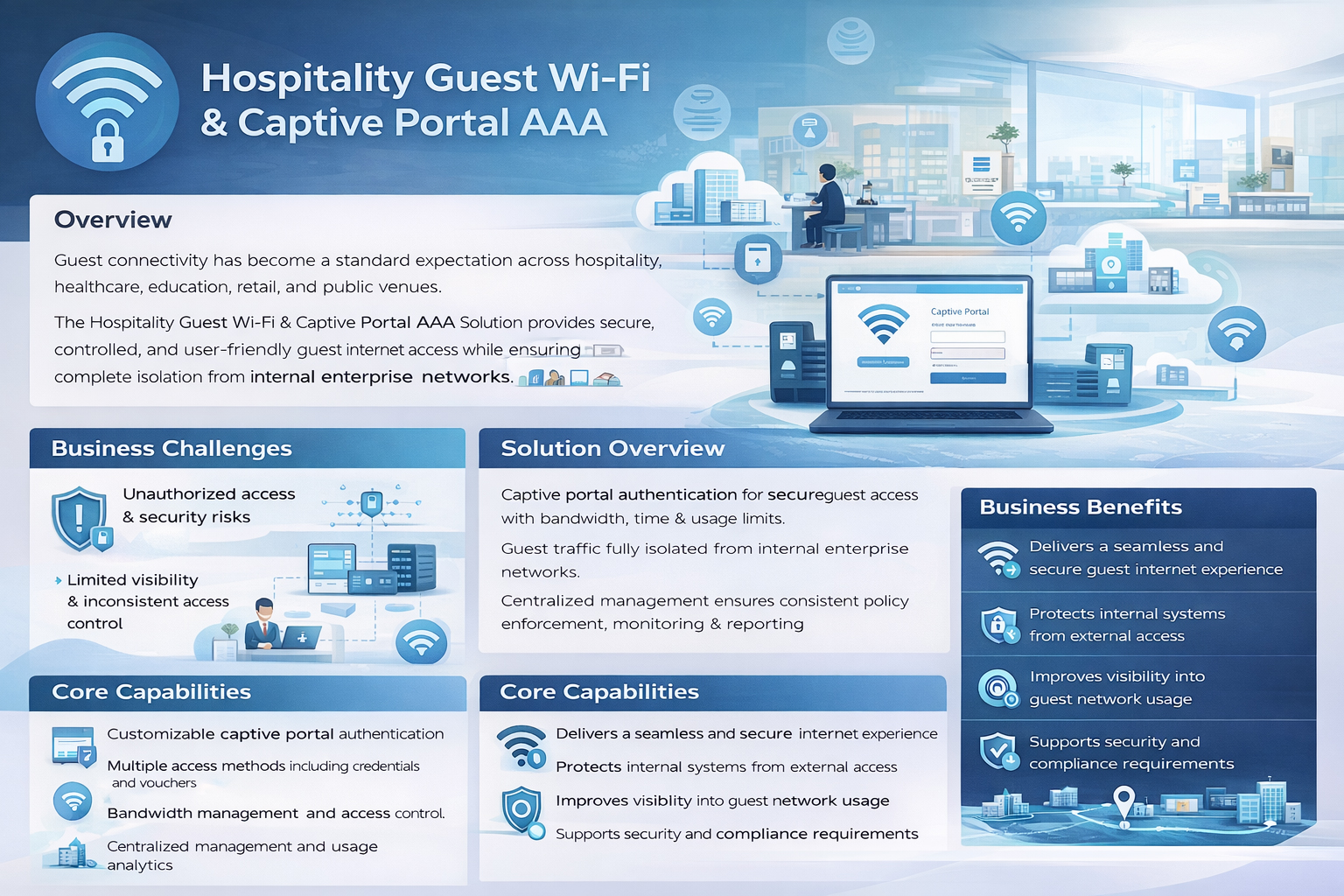 The Hospitality Guest Wi-Fi and Captive Portal AAA Solution delivers secure, controlled, and user-friendly guest access while maintaining strict separation between guest traffic and enterprise networks. It enables organizations to offer a professional digital experience without compromising security or operational control.