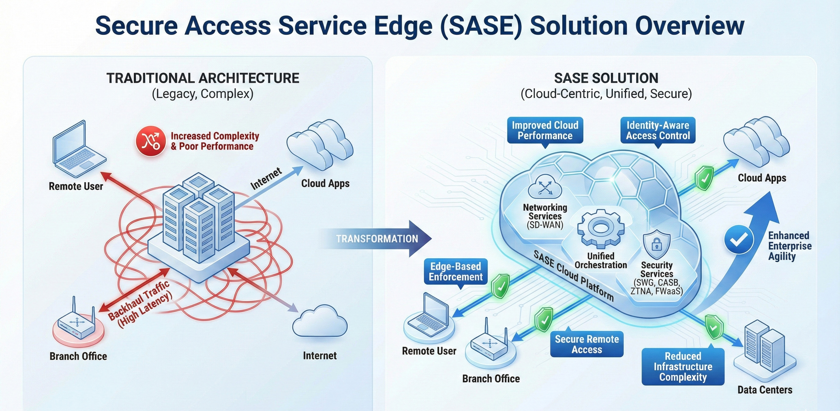 Traditional security architectures backhaul traffic through centralized data centers, increasing latency and operational complexity. This model performs poorly for cloud applications and remote users.