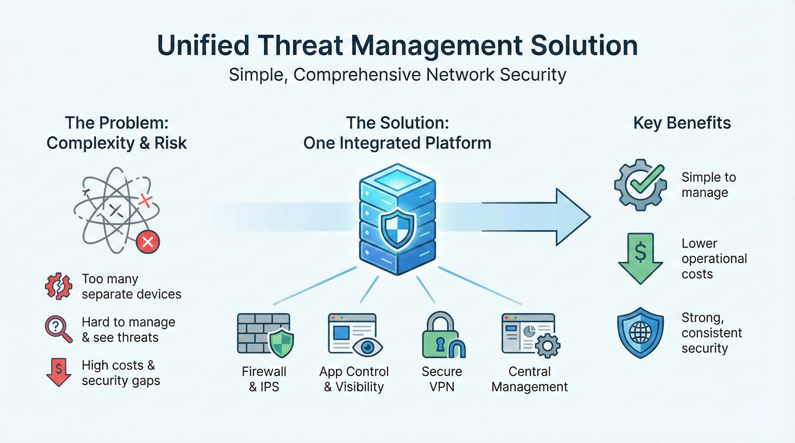 Multiple standalone security appliances increase administrative overhead and create policy inconsistencies. Fragmented visibility delays threat detection and response.