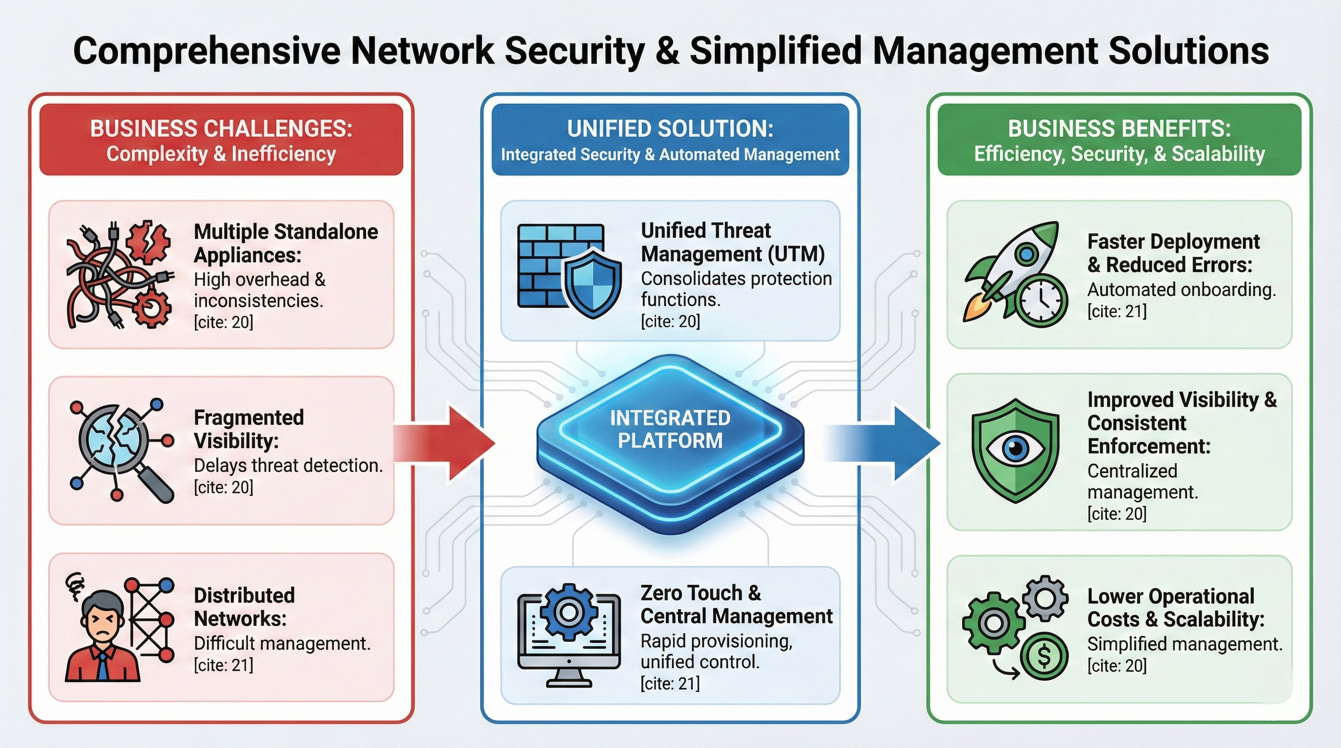 Devices automatically receive configurations upon connection. Centralized management enables real-time monitoring, updates, and policy enforcement across all sites.